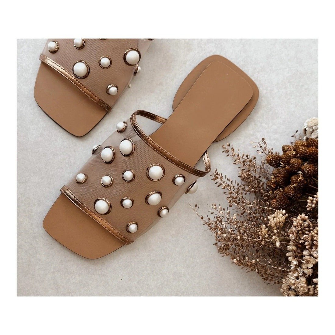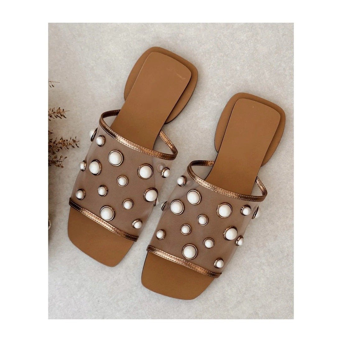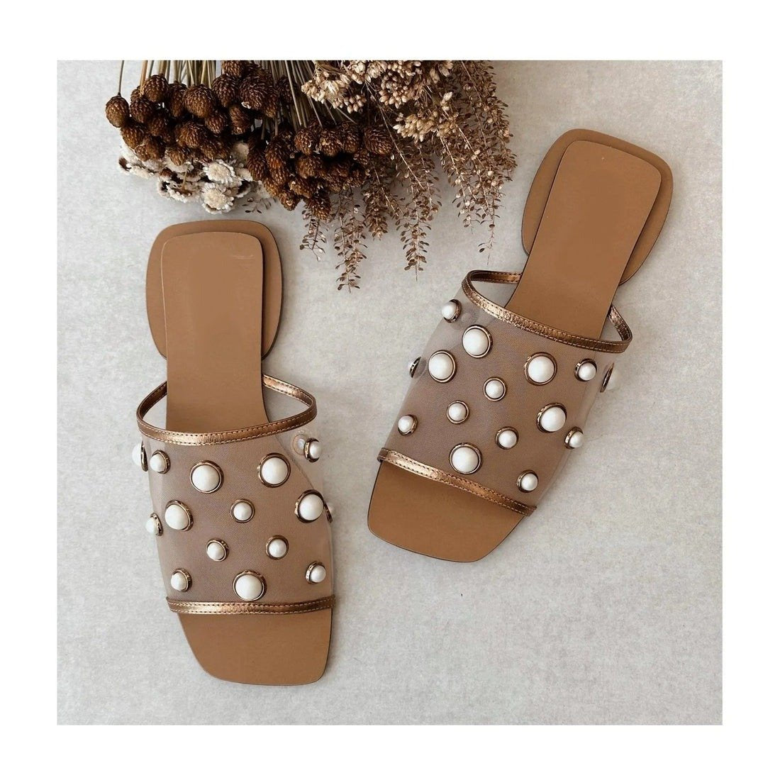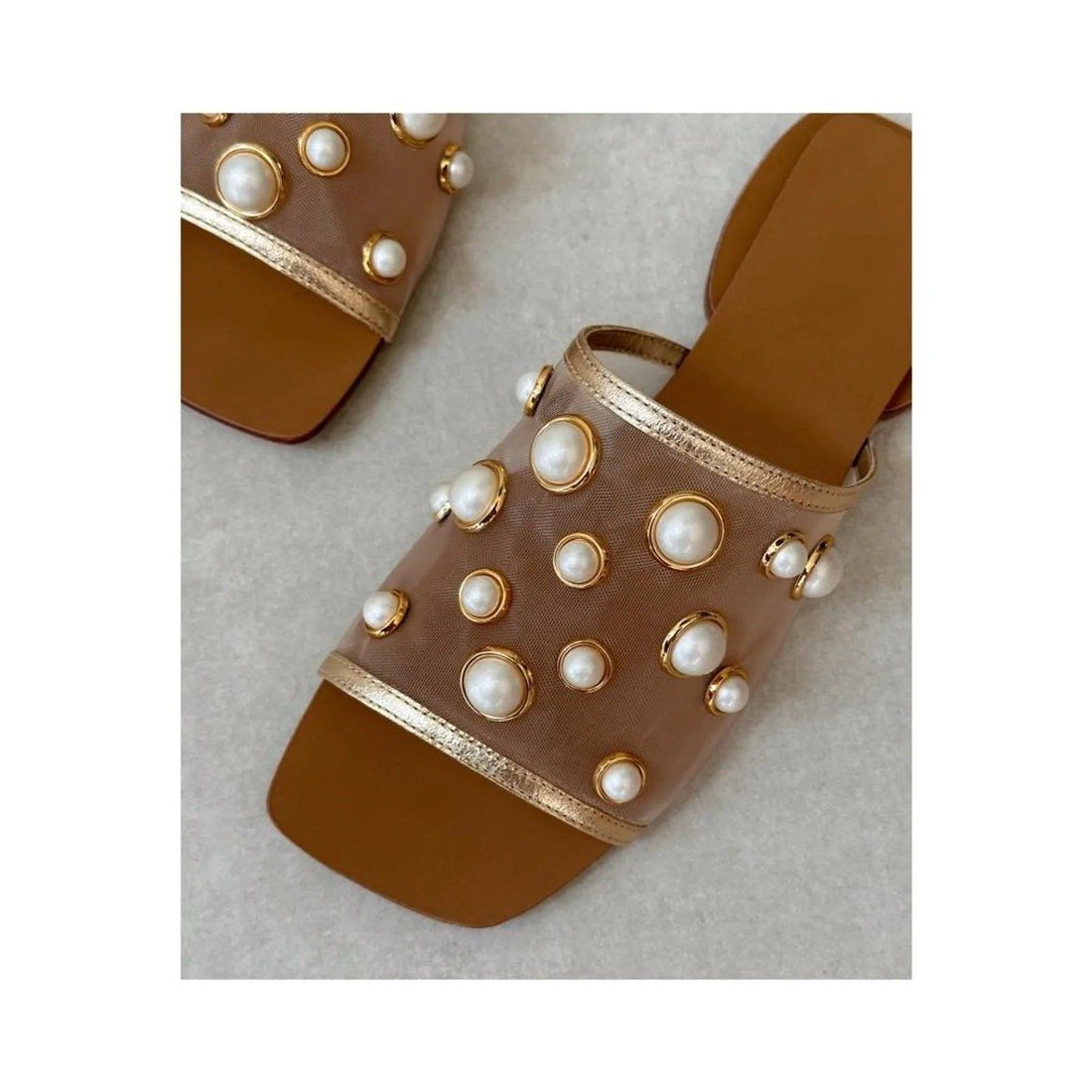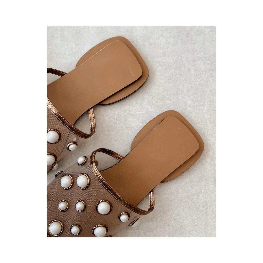 Square Toe Mesh Pearl Flat Slippers